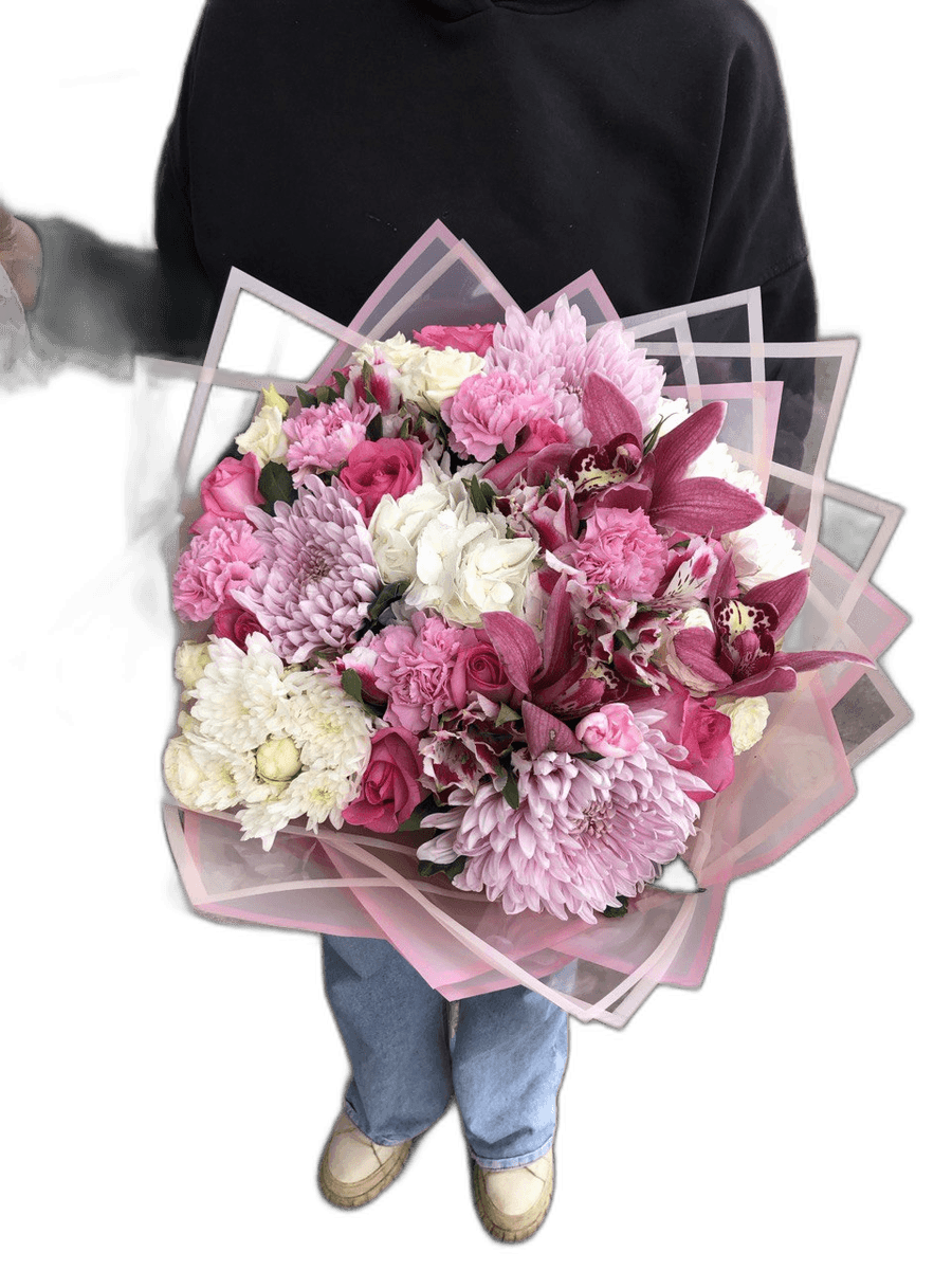 Большой букет с розами, гортензией и хризантемами